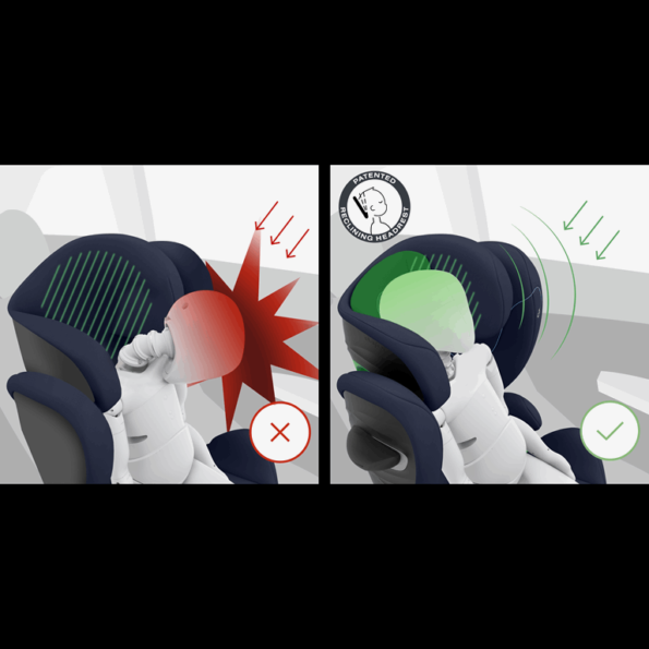 Charakteryzuje się opatentowanym, odchylanym zagłówkiem, który gwarantuje bezpieczną pozycję do spania, Liniowym Systemem Ochrony Bocznej (System L.S.P) oraz możliwością regulacji oparcia za pomocą jednej ręki.